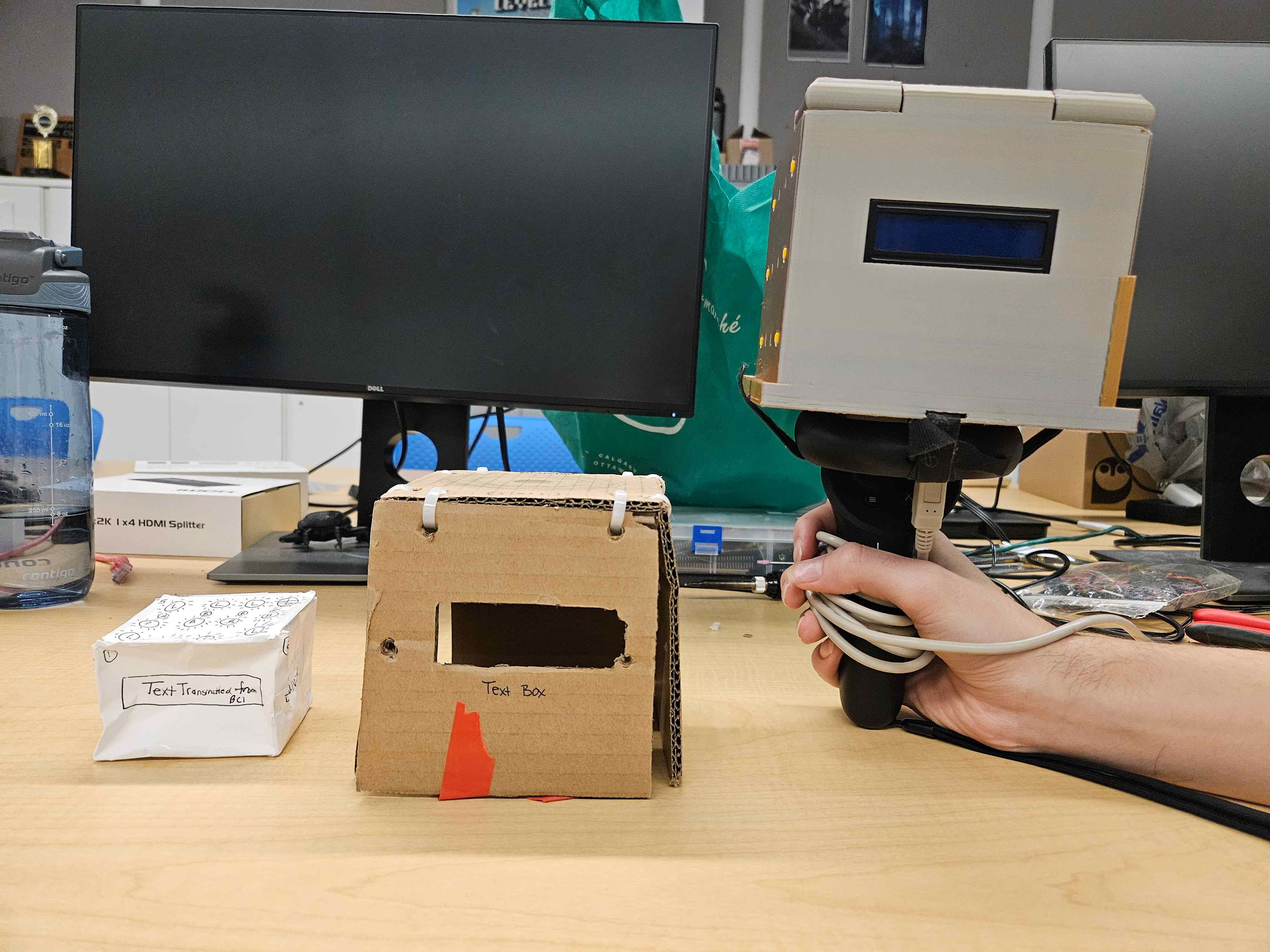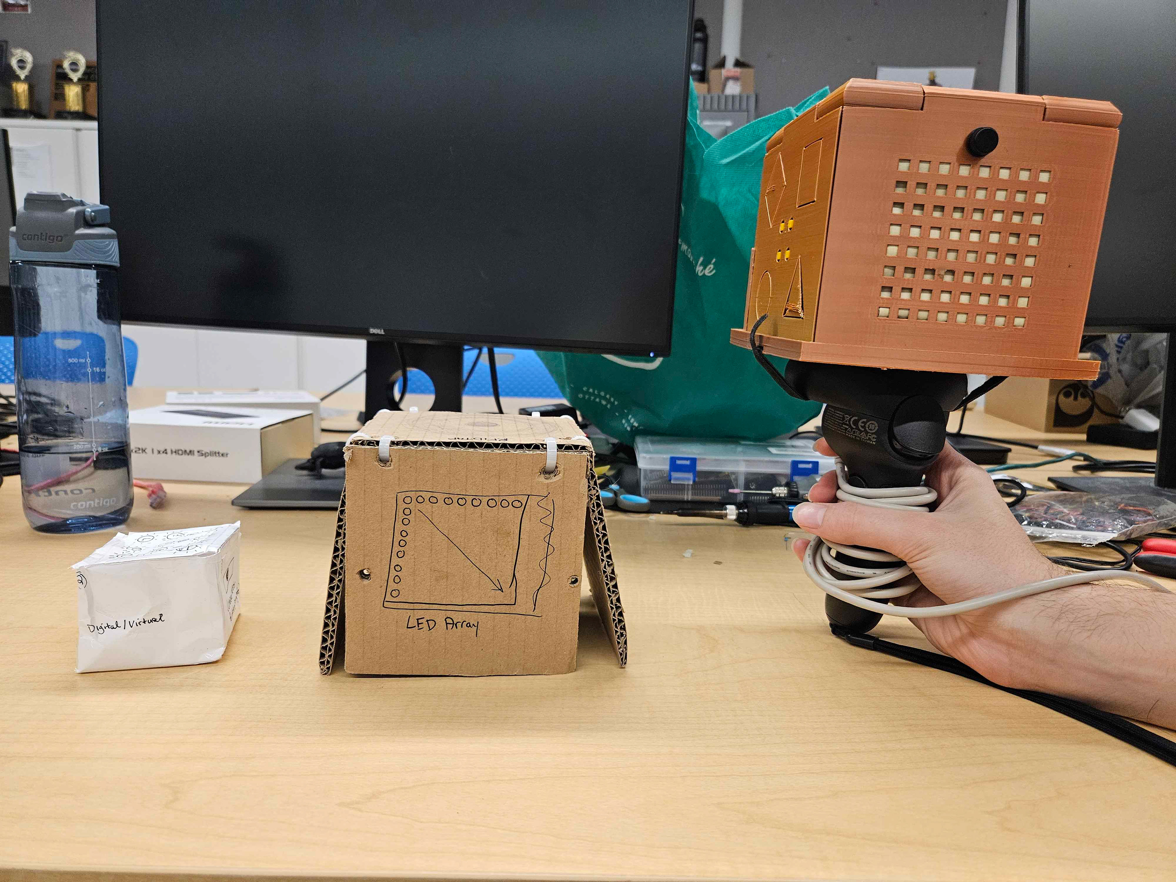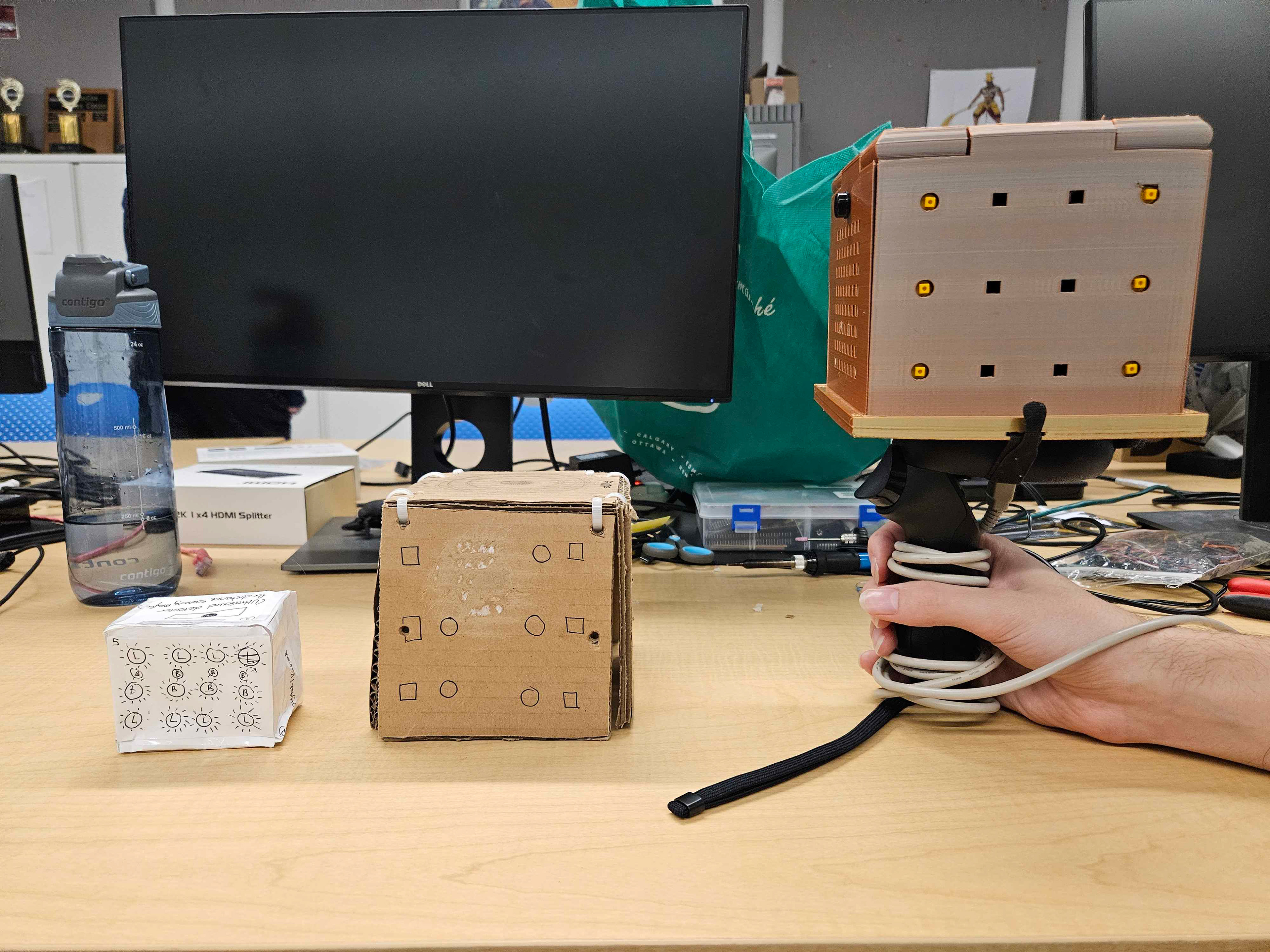 The twist? Player 1 can ask questions, but Player 2 cannot. Instead, Player 2 uses a limited communication system: selecting responses on a digital keyboard using VR eye-tracking. These messages are sent to Player 1's cube and displayed on the LED screen. To succeed, players must find creative ways to collaborate under these communication constraints, using logic, observation, and clever questions to complete the puzzles together.